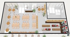 說到泡茶,就不得不提起茶具,而茶具包含許多不同的種類與功能,可以說是與飲茶文化息息相關,因此以「茶狐」諧音「茶壺」,將茶文化與校園文化融合,做為店鋪命名由來。風格選擇以茶具俯視圖作為空間設計參考。平時作為泡茶、喝茶的我們都是以俯視的角度端看茶具,這次不妨就讓我們成為那茶湯,流淌在這樣視角的空間規劃中。在命名、概念、空間規劃就緒後,思考什麼地方適合這樣的閒情雅致、讓人佇足停留呢?一餐擁有大片玻璃窗且能遠眺人社二館前的樹林,如果能來場下午茶該有多好!