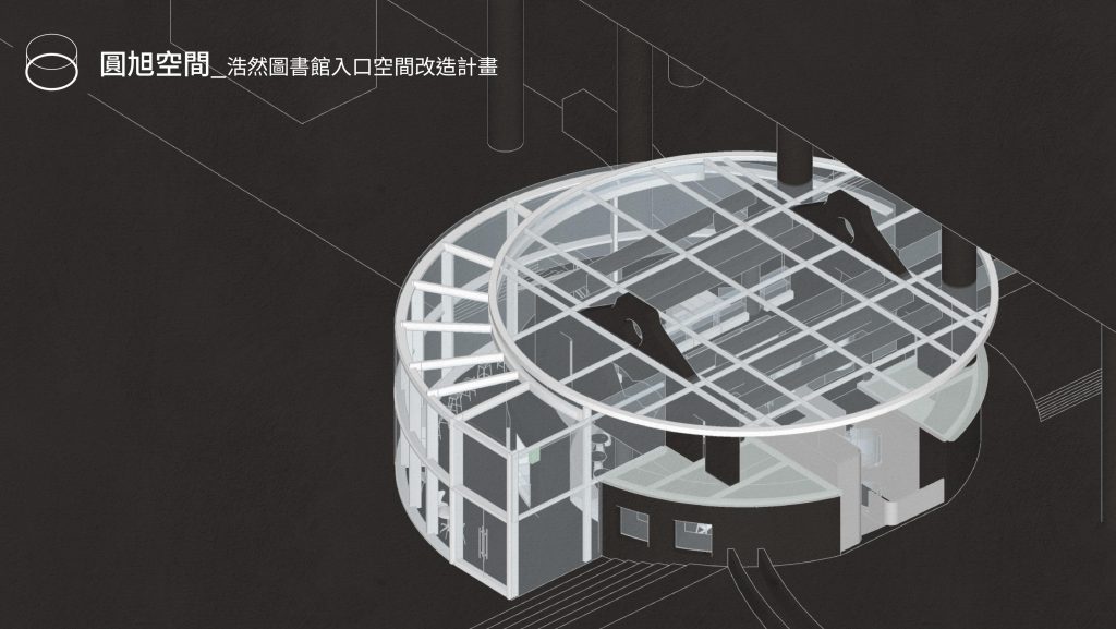 浩然圖書館位於校園中心,是主要通行動線與人流匯聚之處。我們計畫活化館旁閒置的圓形半開放空間,結合新舊設計語彙,將其轉化為兼具功能與文化特色的交流場域。設計上,圖書館量體厚重,因此新空間以輕透為主,藉由半圓形透明半戶外結構,形塑與本體對比的視覺效果。透過圓形交疊的構成手法,延續原有場地的圓形特質,營造通透流動感。此設計不僅活化閒置空間,更在新舊融合中創造出美學與實用兼具的場域,成為校園中一處交流停留與共享的新據點。