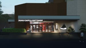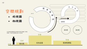 設計基地設於大禮堂,利用延伸聯合服務中心空間並保留過道,以維持流動性。考量咖啡廳屬對外服務、聯服中心櫃檯屬對內服務,本設計將兩者整合為「服務櫃檯帶」,有效結合吧檯與櫃檯功能,同時清晰區劃紀念品販售區。二樓部分引入旋轉樓梯,打開原有封閉垂直介面,使咖啡廳與二樓座位區自然銜接。原會議室則移至廊道空間,採開放式設計並以簾幕調節,兼顧通透與隱私。整體空間因此更具互動性與彈性,讓咖啡廳成為交流、休憩與展示的多功能場域。