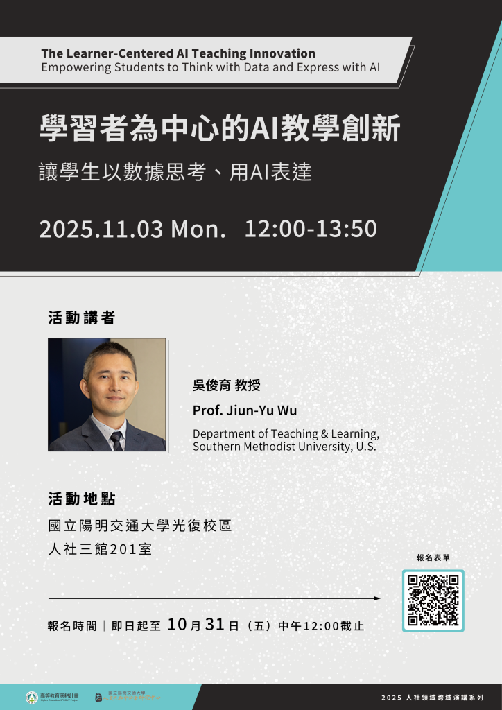 | 12:20–13:30 | 學習者為中心的AI教學創新:讓學生以數據思考、用AI表達 吳俊育 教授(Prof. Jiun-Yu Wu) |