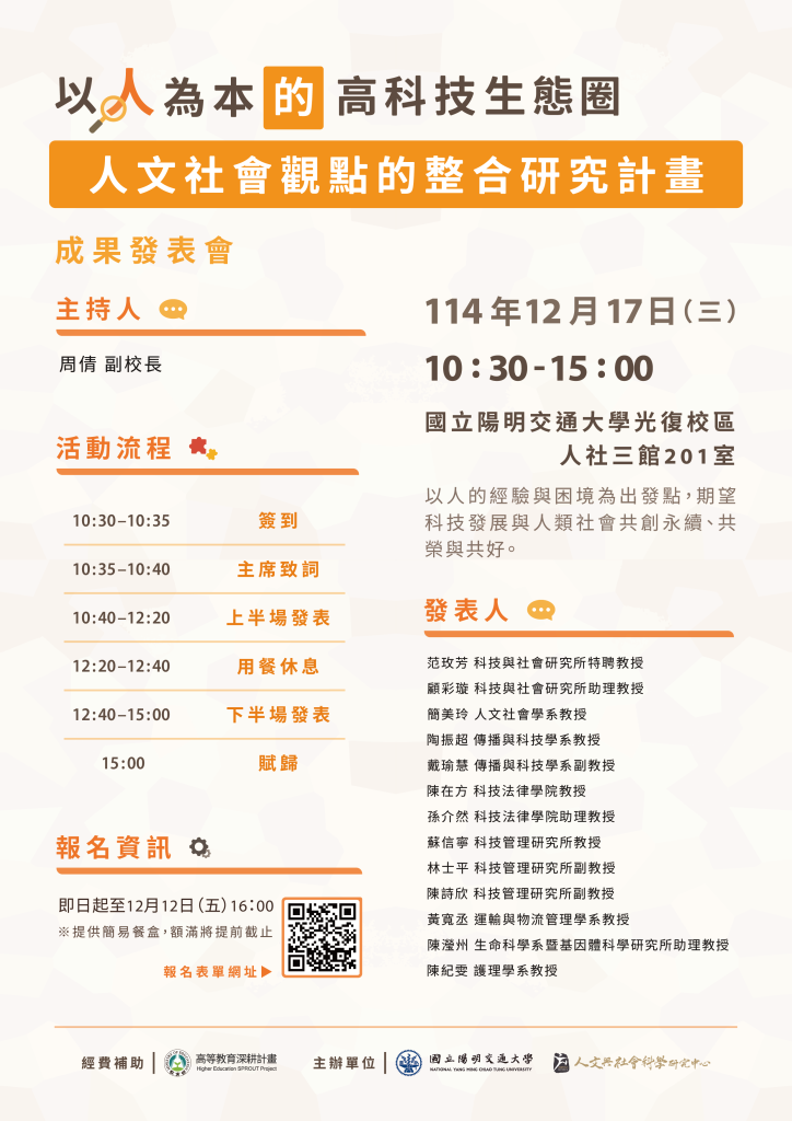 114年國立陽明交通大學「以人為本的高科技生態圈:人文社會觀點的整合研究計畫成果發表會」即將在12月17日(星期三)於光復校區舉行。本中心特別邀請十三位計畫主持人以人文社會觀點分享高科技生態圈的最新研究趨勢,挖掘技術發展過程中需處理的倫理、法律與社會等議題並提出建言,誠摯邀請您蒞臨參與!